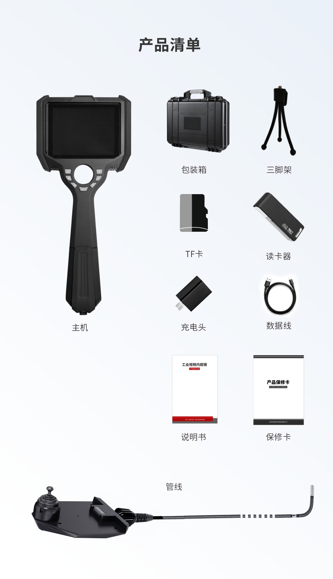 優勢特點:紅白雙光源一鍵切換;攝像頭拾音、錄音功能;探頭360°轉向;可更換不同類型管線;